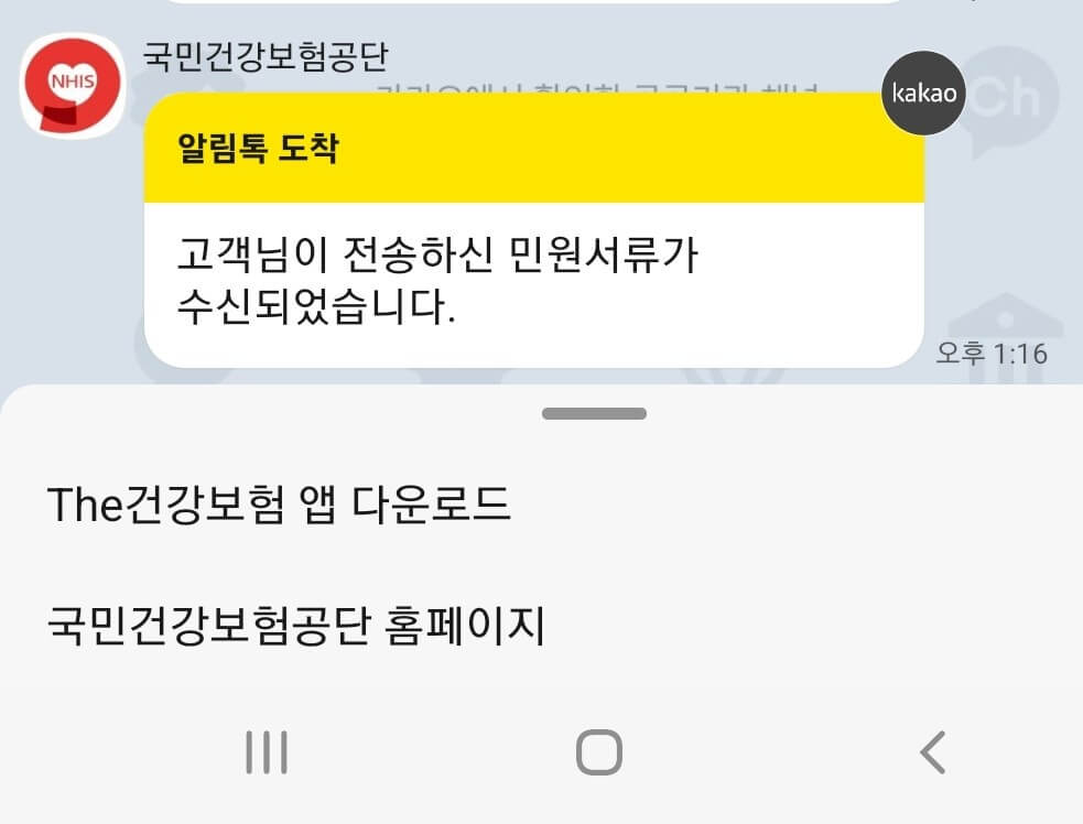 준비물: 퇴직 증명서(근무하던 회사에 요청), 소득정산부과 동의서(국민건강보험공단 홈페이지에서 다운로드), 신분증촬영 이렇게 세 가지 파일을 준비해서 1668-0632로 문자 메시지에 첨부해서 발송을 했습니다. 접수가 되었다면 첨부 사진처럼 카카오톡 메시지로 메시지가 수신되었다고 답변이 옵니다.